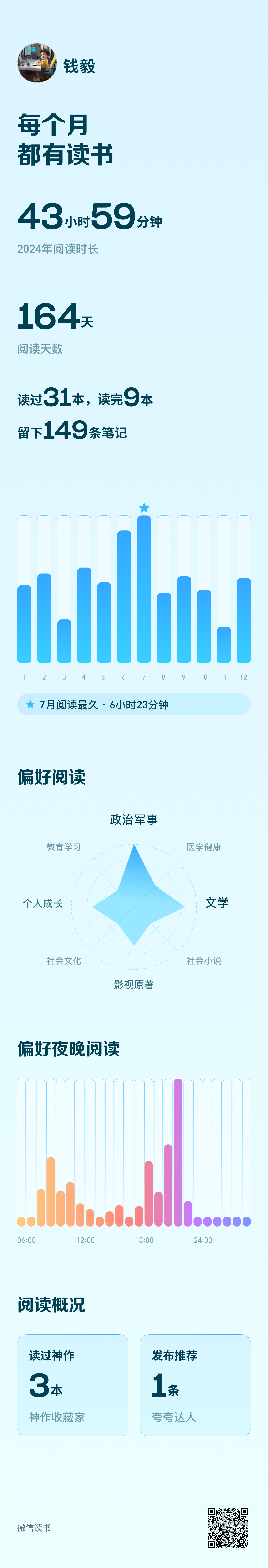 微信读书的年度报告,读完 9 本,另外还有些是通过离线下载的书没统计到。