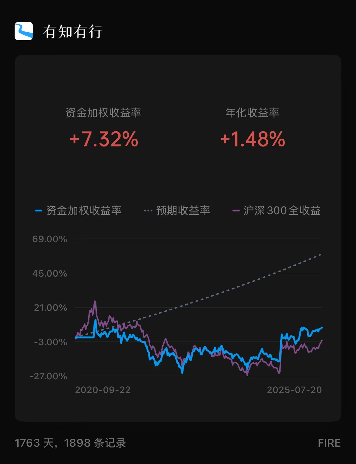 FIRE-203期-20250720 Qian Yi 2025-07-20 投资 FIRE 本周数据概要 投入 0 收益率 本周: 0.37% / 沪深300:1.09% 本年: 6.63% / 沪深300:5.11 账本 消费 3550(2000父母体检) 交易无 感想这周的水逆期。 打球被🐝在头上蛰了包,痛了2天。 晚上车库打墙被投诉。 电动车充电线断掉。 红绿灯莫名其妙追尾,而且追的是网约车。 公司由于香港那边流程问题,工资还没发。 啥也不说,最近要低调,要去北高峰拜一拜。 好内容 网易丁磊:成为最快乐的首富 | 中国互联网故事4