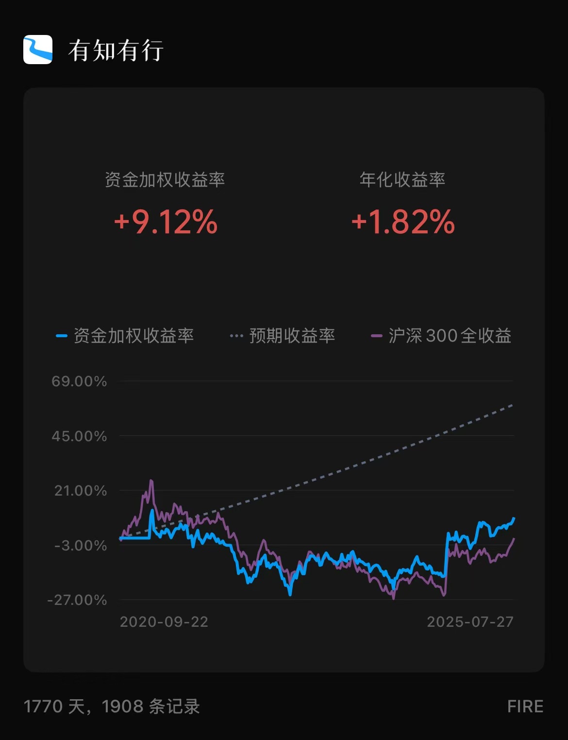 FIRE-204期-20250727 Qian Yi 2025-07-27 投资 FIRE 本周数据概要 投入 0 收益率 本周: 1.63% / 沪深300:1.69% 本年: 8.36% / 沪深300:6.97 账本 消费 600 交易 钱-支付宝基金 卖出 35416 钱-支付宝基金 卖出 37857 感想 这周把支付宝主动基金的仓位降了25%,后续留给长稳海。 公司财务情况让人焦虑,需要做好准备,见机行事。 好内容 圈子不同,你别硬融 人类“随身听”简史