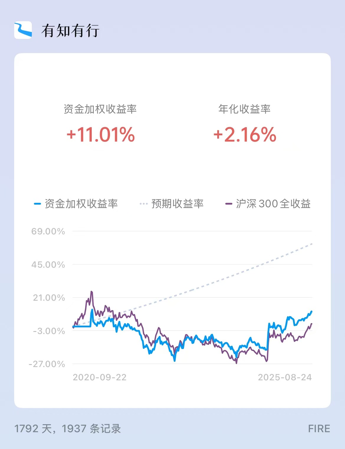 FIRE-207期-20250817 Qian Yi 2025-08-18 投资 FIRE 本周数据概要 投入 0 收益率 本周: 1.86% / 沪深300:1.96% 本年: 10.23% / 沪深300: 9.06% 账本 消费 700 交易无 感想 如何利用好时间,做更有意义的事情? 好内容 千年生存焦虑: 少林的袈裟褴褛与金钱游戏 做人不掉链子,天天过好日子 兴趣班怎么选?踩雷,真香,排课大分享