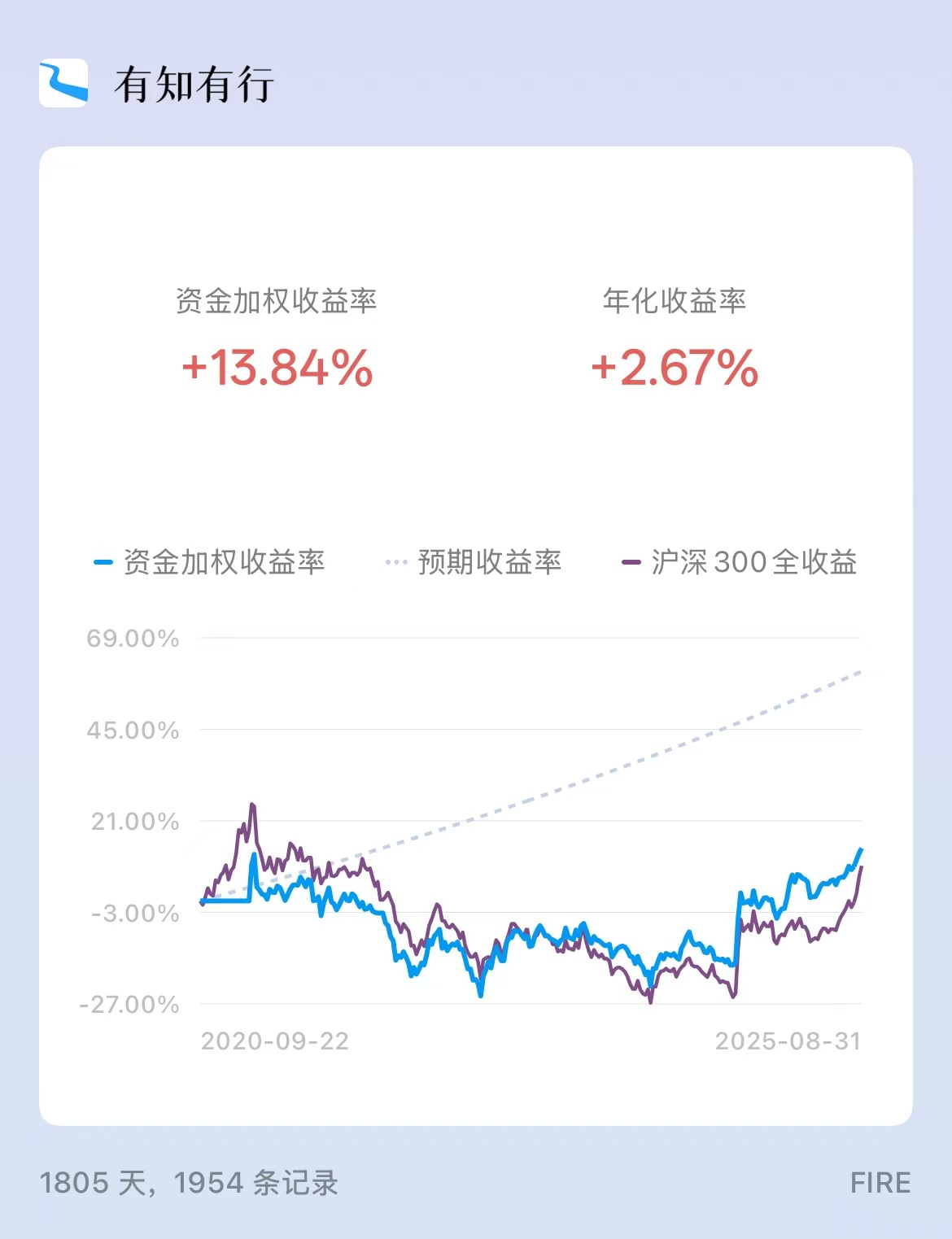 FIRE-209期-20250831 Qian Yi 2025-08-31 投资 FIRE 本周数据概要 投入 0 收益率 本周: 1.3% / 沪深300:2.71% 本年: 12.99% / 沪深300: 16.82% 账本 消费 1165 交易无 感想 糟心的一周,公司解散。 好内容 人间攻略之叔本华说得好