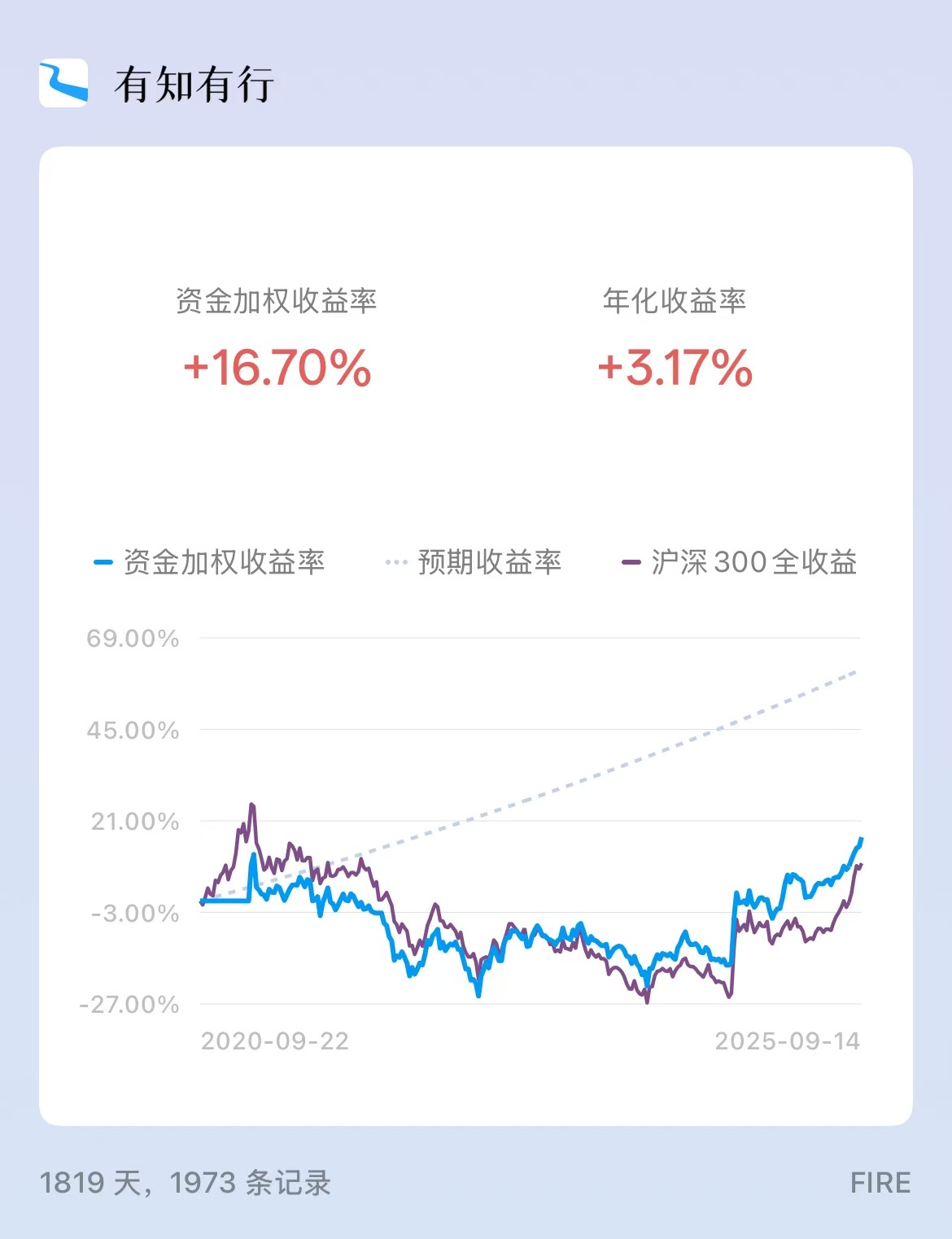 FIRE-211期-20250914 Qian Yi 2025-09-14 投资 FIRE 本周数据概要 投入 0 收益率 本周: 2.3% / 沪深300:1.38% 本年: 15.8% / 沪深300: 17.53% 账本 消费 1351 交易 无 感想“人永远是有机会的,没有任何一个选择能决定你的一生,你最终会成为你本该成为的样子。”段永平 好内容 段永平语录深度解析:如何让选择成就你的人生? 喵神onevcat: Vibe Coding及日本工作与生活 好状态不是等出来的